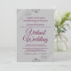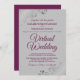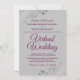 Só porque você foi forçado a mudar seu casamento para uma cerimônia virtual, não significa que você não pode enviar belos convites. Este convite elegante apresenta a inscrição roxa do chassis do rico ou a letra magenta colorida num fundo de cinza com um filigre floral ou caramujos e espirais nos cantos. Uma maneira perfeita de convidar seus amigos e família para compartilhar em seu dia especial, mesmo que eles não possam estar lá pessoalmente.