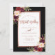 Belo Convite Virtual de Casamento Moody com um design de cor-de-água floral vermelho arrojado com sotaques de folha de rosa de ouro falsos e um guião com letras de mão com fundo preto. Convocação de Casamento de Rosa Negro Floral de Burgundy. Personalize com o texto do seu casamento.