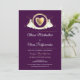 Um convite virtual de casamento com uma design de dois vestidos de casamento em ambos os lados de um coração de ouro e um fundo roxo. (Os elementos ouro são ouro falso e não folha de ouro.)