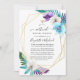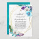 Folhas tropicais de turquesa e de cor d'água roxa online, convite para cerimônias virtuais de casamento a longa distância com estrutura geométrica dourada e tipografia elegante.