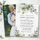 O Cartão de Convite para Casamento de Cores Biológicas Elegantes Modernos inclui folhas de eucalipto, folhagem botânica verde, folhas azuis empoeiradas e outros belos lençóis botânicos. Foto de volta.