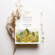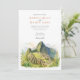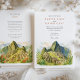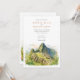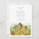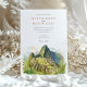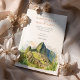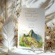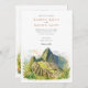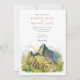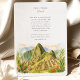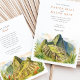 Anuncie seu casamento com este convite extraordinário de aquarela, mostrando a majestosa cidade antiga de Machu Picchu no Peru. A frente apresenta as ruínas, seus picos de montanha ao redor, renderizados em um estilo de aquarela artística macia. O fundo mostra os toques da paisagem turva e montanhosa peruana. Enquadrar a bela cena são uma folhagem verde. O verso, projetado para "Os Detalhes Mais Finos", continua a cena cativante, apresentando a montanha Machu Picchu e as montanhas circundantes, enquadradas por folhagem colorida. O estilo de aquarela suave dá a esta suite uma sensação romântica e aventureira. É perfeito para um casamento de destino no Peru, uma comemoração de temas viagem, ou para qualquer casal que aprecie a história, a beleza natural, e um toque de desejo desesperado.