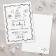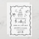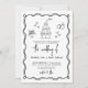 Este convite de casamento único e caprichoso é perfeito para casais que procuram adicionar um toque lúdico e criativo ao seu grande dia. Projetado em preto e branco clássico, ele tem o charme de uma obra-prima rabiscada à mão, como se desenhada amorosamente com anotações manuscritas. A peça central do design é uma moldura ondulante amarrada com um doce arco no topo, contendo os detalhes do seu casamento numa mistura de roteiros e fontes manuscritas para uma sensação divertida e pessoal. Ao redor do texto estão ilustrações peculiares e deliciosas, incluindo anéis de casamento, um bolo hierarquizado, corações, uma torre de champanhe, flores e um carro de "Recem casados". Estes rabiscos ao estilo de esboço e arte de linha desajeitada dão ao convite uma vibração moderna e descuidada enquanto ainda são elegantes. O verso acrescenta um toque pessoal extra com um monograma bonito, escrito à mão, das iniciais do casal enquadradas por pequenos corações. Totalmente personalizável, este design é perfeito para casais modernos que querem algo leve, na moda e cheio de personalidade. Celebre sua história de amor com este convite de casamento divertido e artístico! Disponível em uma versão de impressão ou você pode comprar como um convite digital para download.