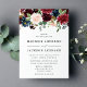 O convite para o casamento floral elegante apresenta uma borda floral no topo com flores rosas, cor-de-rosa pincelado e azul-marinho complementadas por uma folhagem verde-luxuosa com seus detalhes de casamento mostrados abaixo. O verso do convite apresenta um fundo de cor azul-d-água opcional marinho.