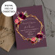 Na frente: um gabinete, fundo roxo profundo com uma falso estrutura geométrica dourada. Decorados com flores, rosas e penas do estilo "boho" escuras e burguesas. Modelos para seus nomes e detalhes do casamento. Os nomes são escritos com um estilo escrito à mão, letras pretas. Traseiro: Cassis, cor de fundo roxa profunda.