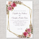Chic Cassis, convite de casamento elegante e formal apresenta aquarela de flores de casamento românticas exibidas com folhagens verdes em um fundo branco clássico e nítido. Uma moldura geométrica em forma de cristal com cor dourada brilhante fornece um toque moderno. A redação tradicional e clássica fornece sofisticação atemporal. Personalize o design do casamento com seus detalhes em letra e caligrafia elegantes na cor roxa cassis. O verso do convite é na cor roxa cassis sólida, completando o design.