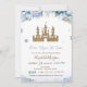 Lindo castelo de brilho dourado com flores azuis e estrelas. Esses convites de chá de bebê são facilmente personalizados para o seu evento, basta adicionar seus detalhes.