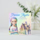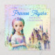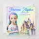 Um ajustado de convite de conto de fadas para uma princesa! Uma bela princesa com tranças pastéis e um castelo arco-íris.