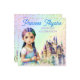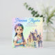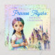 Um ajustado de convite de conto de fadas para uma princesa! Uma bela princesa com tranças pastéis e um castelo arco-íris.