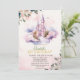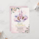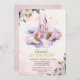 Este primeiro convite de aniversário com castelo aquarela em nuvens com flores e bolinhas.