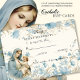 Apresentando um belo convite Batismal Christening desenhado e personalizado com uma borda floral azul, a Bênção Virgem Maria segurando Jesus e um verso das escrituras na frente. Todos os textos e fontes podem ser modificados.