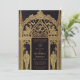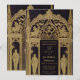 Este convite vintage preto e dourado para uma festa de aniversário com tema medieval tem um portão de castelo medieval entre duas torres góticas, guardado por dois cavaleiros em armaduras, com alabardas. Na parte superior existem outros dois cavaleiros em armadura, montados a cavalo, carregando bandeiras, e no centro, acima do portão, há um leão heráldico. O texto é escrito em letras douradas dentro do portão. O nome é escrito com fontes góticas em estilo medieval. O fundo é preto.