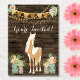 Este design de convite de aniversário para meninas apresenta um bonito pônei de pintura de palomino. Ela está entre os arranjos de flores bonito em charmosos jarros de mason. Há um fundo de madeira rústico em celeiro decorado com cordas de flores delicadas e uma faixa bonito de cobertura de ouros com flores. Este convite pode ser personalizado com um nome e todos os detalhes da sua festa.