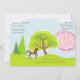 Cavalo castanho bonito personalizado com sela cor-de-rosa num convite de aniversário de pônei da floresta giro e colorido. ~