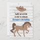 Cavalo de silhueta marrom personalizado com um chapéu de cowboy em um convite de aniversário de fundo de madeira para garotos. Alguns gráficos de Poppydreamz em Mygrafico.com *