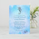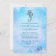 Um convite de casamento com um desenho de tinta preta de um cavalo de mar e uma concha. O fundo é uma bonito textura azul de aquarela.