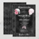 Convite de casamento sombriamente lindo com a frase Até Que a Morte Nos Separe, caveiras, mãos de esqueleto e um fundo com padrão de diamante preto. O verso do convite tem um buquê floral de rosas complementar. Perfeito para um casamento gótico ou de Halloween.