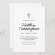 Composto de escrita cursiva e tipografia serifônica; Tudo contra um pano de fundo branco. Uma simples cruz de ouro falsa decora sutilmente a tipografia. Este é um funeral clássico, simples e limpo ou um convite memorial. "Na memória amorosa" tipografia. Este é projetado pela White Oak Memorials, exclusivo para Zazzle. Disponível aqui: http://www.zazzle.com/store/whiteoakmemorials
