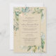 A design botânica elegante começa com uma armação de ouro cintilante rodeada por uma variedade de folhas e vinhas verdes. Há também folhas de prata clara e tons de ouro. Pequenas flores cor-de-rosa adicionam um toque floral. A parte de trás da celebração do convite à vida é uma lavagem a aquarela verde profunda. Todo o texto pode ser facilmente editado para criar uma lembrança pessoal.