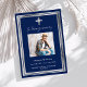 Um elegante, moderno, simples funeral/celebração de um convite à vida. Um fundo azul marinho decorado com uma cruz falsa de prata e quadros falsos de prata. Personalize e adicione um nome de foto e detalhes. Texto branco.