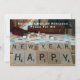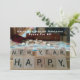 Jogo de conselho com as palavras "Feliz ano novo" soletradas nos quadrados de blocos de madeira. Altere o nome e a mensagem da sua. O cartão divertido tem o mesmo jogo de palavras no banco do cartão. Embora diferente do mostrado na frente.