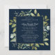 A celebração elegante de um convite à vida quadrado apresenta um quadro botânico de bagas brancas e flores e folhagem em um fundo azul escuro. O nome da pessoa morta está escrito em um texto tradicional. Todo o texto pode ser facilmente editado para criar uma lembrança pessoal.
