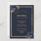 Um fundo azul marinho, uma falso estrutura dourada. Decorado com flores azuis, florais. Personalize e adicione nome, datas e texto. Adicione uma foto atrás.