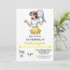 Uma ilustração festa de aniversário divertida, com tênis, com um jovem jogador espiritado, pronta para servir a bola com confiança. Ela está vestida de um alto branco casual, uma saia tênis amarela brilhante, e uma faixa de cabeceira e pulseiras coincidentes. A vibração do partido é capturada com cores alegres e energia viva, fazer perfeita para convites, decorações ou temas centrados em esportes, diversão e celebração.