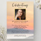 Honre seu ente querido com este lindo convite de celebração de vida. A frente apresenta uma cena aquática ao pôr do sol, sua foto emoldurada por uma borda dourada falsa e detalhes da sua celebração. (Altere facilmente a foto de fundo para uma de sua escolha.) O verso oferece espaço para outra foto e poema ou escritura (ou exclua). O modelo é muito fácil de usar e alterar - crie um convite que seja único, clássico e será guardado para sempre.
