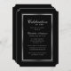Celebração elegante de preto e prata do convite à vida com detalhes sobre dentro de um quadro prateado na frente e uma foto na parte de trás.