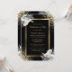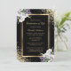 Celebração floral elegante de preto e ouro com convite à vida, com uma estrutura de ouro enfeitada com flores roxas, lírios brancos, orquídeas e verde. Uma foto floral no fundo.
