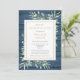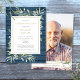 Um convite de lembrança de foto de celebração da vida com vegetação em um fundo de painéis de madeira azul rústico. Criado por Thisisnotme©