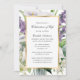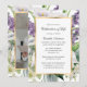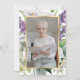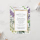 Celebração floral elegante de branco e ouro, com convite à vida, com um quadro de ouro enfeitado com flores roxas, lírios brancos, orquídeas e verde. Uma foto floral no fundo.