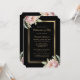 Celebração floral elegante de preto e ouro com convite para a vida apresentando um quadro de ouro enfeitado com peônias cor-de-rosa. Uma foto dourada com peônias cor-de-rosa na parte de trás.
