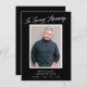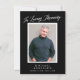 Este elegante cartão com fotos memorial *e* Comemoração do convite Life apresenta um fundo preto, uma fotografia vertical solteiro e uma tipografia simples, mas elegante, em branco. Na parte de trás, o fundo negro se repete com texto para um convite à celebração da vida. Você pode remover o texto no verso, se desejar, basta clicar em "editar com a ferramenta design".