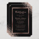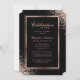Celebração elegante de ouro preto e rosa com convite para a vida apresentando detalhes do evento dentro a rosa dourado armado com brilho rosa dourado na frente e uma imagem dentro de rosa dourada no verso.