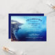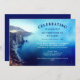 Convite para comemoração da vida em tons de azul com uma lavagem a aquarela encontrando uma foto de uma praia ruidosa. O convite para funeral no Oceano personalizado com o nome e os anos de vida do seu amado. Convite memorial à aquarela azul com texto azul e branco e sem fotografia.