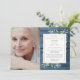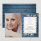 Um convite de lembrança de celebração da vida personalizado rústico com vegetação em um fundo de painéis de madeira azul. Criado por Thisisnotme©