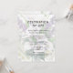 Elegante calla lily comemoração do convite à vida com um fundo floral de flores roxas, lírios, orquídeas e verde.
