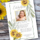 Honre o seu amado com esta bela celebração do convite à vida. A frente mostra uma fronteira de girassóis bonito e a foto de seu ente querido emoldurada em ouro falso. Adicione facilmente os detalhes do seu serviço de celebração. A parte de trás também oferece espaço para uma foto, poema ou script (ou exclusão). O modelo é muito simples de usar e mudar - tão único e bonito e será acarinhado para sempre.