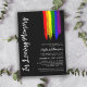 Convite funerário LGBTQ com uma bandeira do orgulho de bruxos no orgulho é colorido do arco-íris contra um fundo preto. Convite de serviço memorial LGBTQ a preto com a bandeira do orgulho pintada em pinceladas apressadas. Convite para comemoração da vida LGBT personalizado com o nome de seu ente querido em um roteiro de pincel sob uma versão de pincelada da bandeira do orgulho e uma cruz.