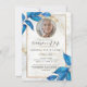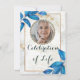 Folhas azuis criando uma folhagem moderna com poeirento e estrutura dourada. O convite para o memorial do funeral Apresenta um quadro elegante para colocar a foto da sua amada pessoa com um estilo botânico e floral. A design também vem com fontes clássicas e caligrafia moderna para torná-la mais bonita. O convite pode ser facilmente personalizado e se você quiser mais personalizações ou recursos extras que você possa contactar, e eu terei o prazer de ajudá-lo.