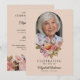 Este belo cartão de convite para celebração floral de vida ou serviço funerário ou memorial (disponível como um evite para download instantâneo ou cartões impressos) homenageia lindamente a memória de um ente querido, misturando elegância com um toque de calor e personalização. A frente apresenta um fundo rosa suave, com uma foto do seu ente querido emoldurada dentro de um arco delicado no topo. Abaixo da foto, um arranjo deslumbrante de flores e folhagens em tons pastéis de rosa, laranja e branco, incluindo rosas e peônias, adiciona um toque suave e reconfortante, complementando perfeitamente o tema sereno. As palavras "Celebrando a vida de" são elegantemente escritas, seguidas pelo nome do seu ente querido e datas de nascimento e morte, criando uma homenagem sincera que é ao mesmo tempo atemporal e graciosa. O verso do cartão convida amigos e familiares a se reunirem em memória, com detalhes do serviço organizados de forma organizada em fontes clássicas. O fundo rosa suave continua com mais elementos florais lindos na parte inferior, mantendo a estética coesa e serena do cartão. Esta seção também inclui espaço para quaisquer pedidos ou informações especiais, adicionando um toque personalizado ao convite. Este cartão serve como uma maneira adorável de comemorar uma vida querida, oferecendo conforto e graça durante um momento de reflexão.
