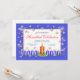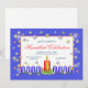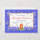 Um convite de festa de Hanukkah com meu design de estrelas prateadas e douradas brilhantes, 8 velas azuis e 1 vela vermelha em um fundo azul e branco. Uma imagem de vela vermelha bonita está no verso.