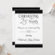 Comece sua festa de aniversário com o nosso convite de celebração de 25 anos de casamento dourado, apresentando um convite deslumbrante em um fundo branco e preto com corações duplos prateados.