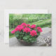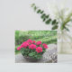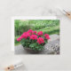 Uma bela plantação de gerânios vermelhos em uma parede de rocha com uma bela paisagem verde atrás dela. Personalizar conforme desejado.