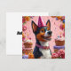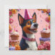 Cachorro feliz vestindo uma festa entre cupcakes coloridos, flores e decorações festivas, celebrando uma ocasião excitante e alegre.