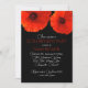 Grande convite de aniversário de papoila vermelha. Os cartões pretos têm texto branco e vermelho em fontes modernas. O nome e o título da honra são impressos a vermelho. O resto do texto é um roteiro giratório. Use para uma festa de aniversário ou qualquer celebração. O reverso é vermelho sólido.