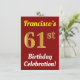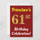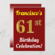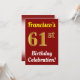 Este design de convite de aniversário apresenta uma mensagem como "A Celebração de Aniversário de 61 ruas de Francisco!", onde o nome pode ser personalizado, e onde o número "61ruas" tem uma aparência de ouro falso. Ele também apresenta um fundo de cor vermelha. Os detalhes do evento no verso podem ser personalizados. Pode ser usado para convidar pessoas para a festa ou festa de aniversário de alguém do 60º aniversário. [~Z0000120]