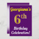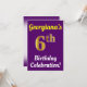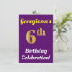 Este design convite de aniversário apresenta uma mensagem como "A Celebração de Aniversário do 6 de Georgiana!", onde o nome pode ser personalizado, e onde o número "6" tem uma aparência falsa de ouro. Ele também apresenta um fundo de cor púrpura. Os detalhes do evento no verso podem ser personalizados. Poderia ser usado para convidar pessoas para a festa ou festa de aniversário de alguém do sexto aniversário. [~Z0000121]